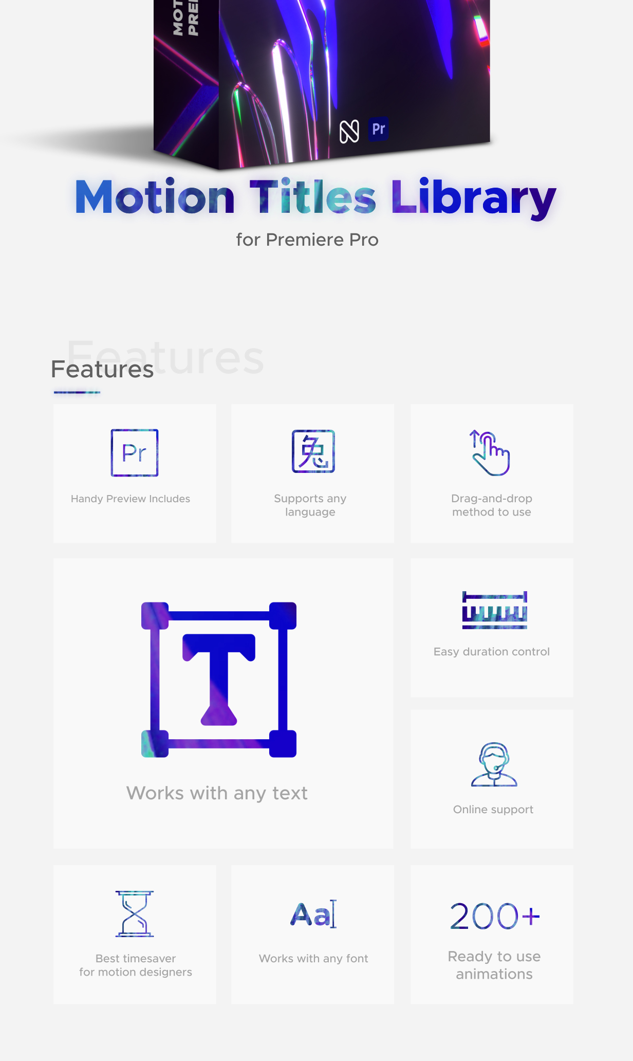 Use in Premiere Pro Over 200 professional Presets & Elements for Premiere Pro. Video Library contains more than 200 ready to use presents and 1000 elements from 12 different categories which can help you make your unique video on a professional level. Colorful, Corporate, Extreme, Glitch, Grunge, Ink Smudge, Letters, Modern, Showreel, Sport, Urban, Vintage. Every category contains different elements and creates unique stylish look. Apply a preset in one click, change text and use Control Panel to change effects and colors. We will frequently update Video Library and add more categories, presets and elements.